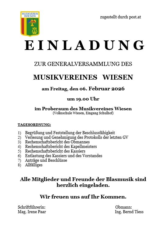 Der Musikverein Wiesen lädt alle Mitglieder, aber auch alle Freunde des Musikvereins, sowie Interessierte zur ordentlichen Generalversammlung am Fr, 06.02.2026 um 19:00 im Proberaum des MV Wiesen (Obergeschoss der Volksschule Wiesen) ein.